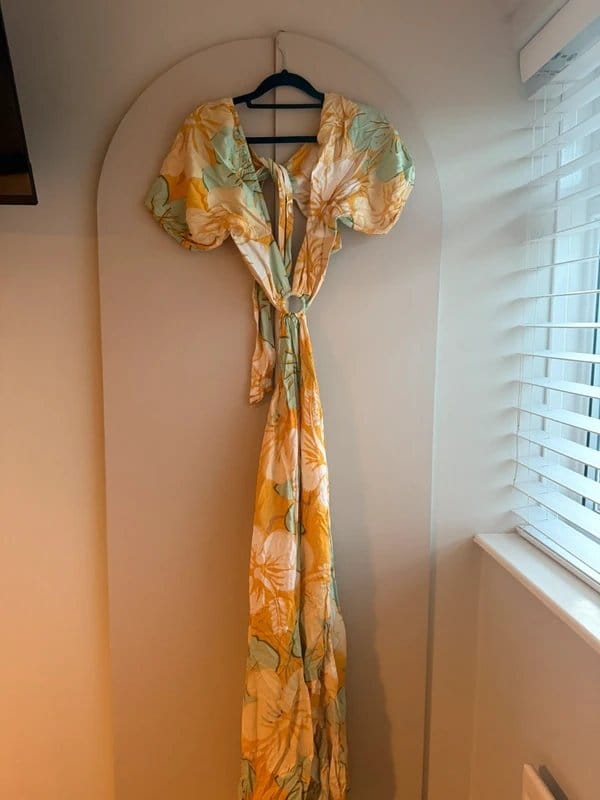 View Vinted's returns policyCut out floral midi dress from ASOS in yellow and white floral print. Perfect for summer or holiday wear.