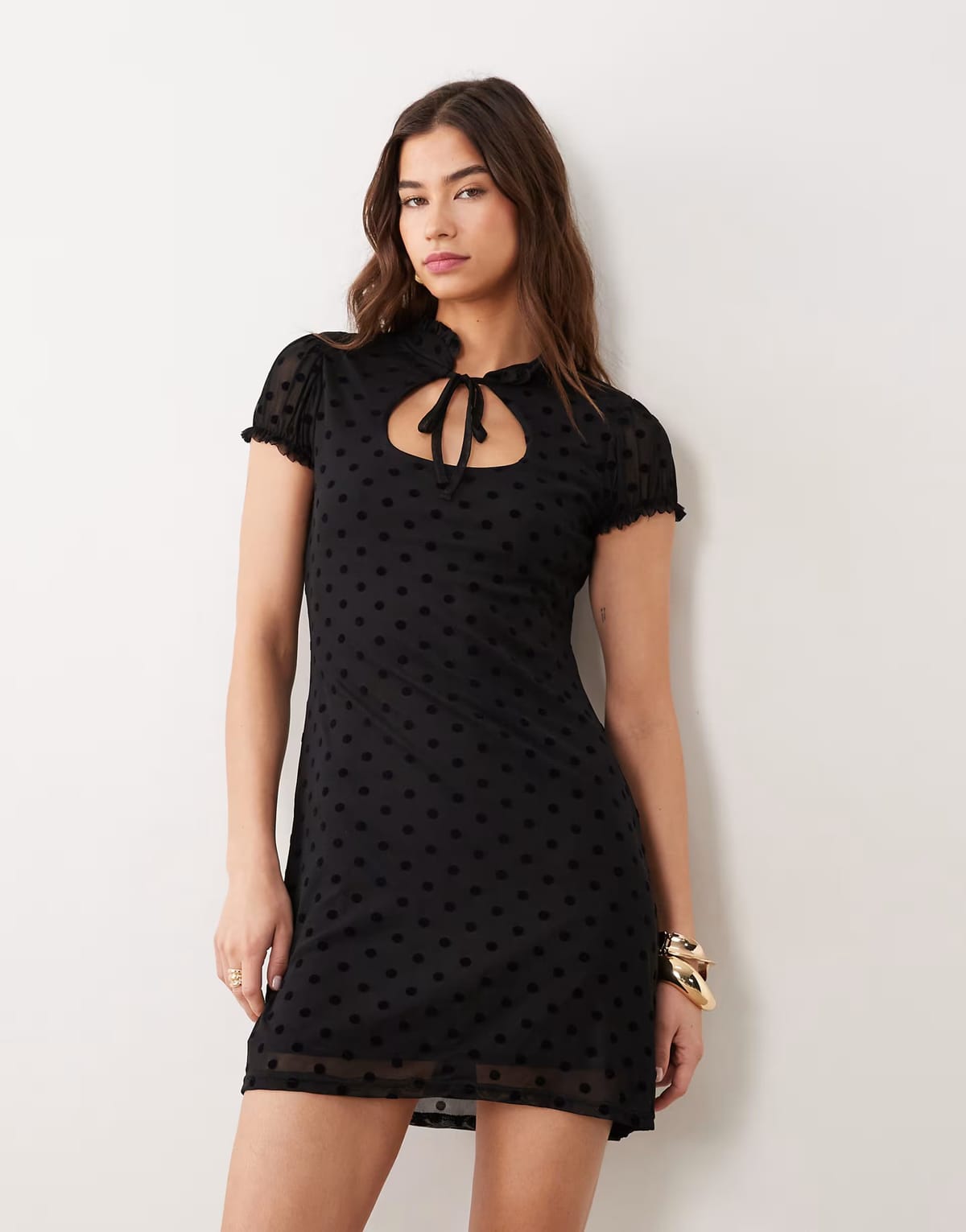 The ASOS Cap Sleeve Keyhole Mini Dress in Black Polka Dot is made from mesh.