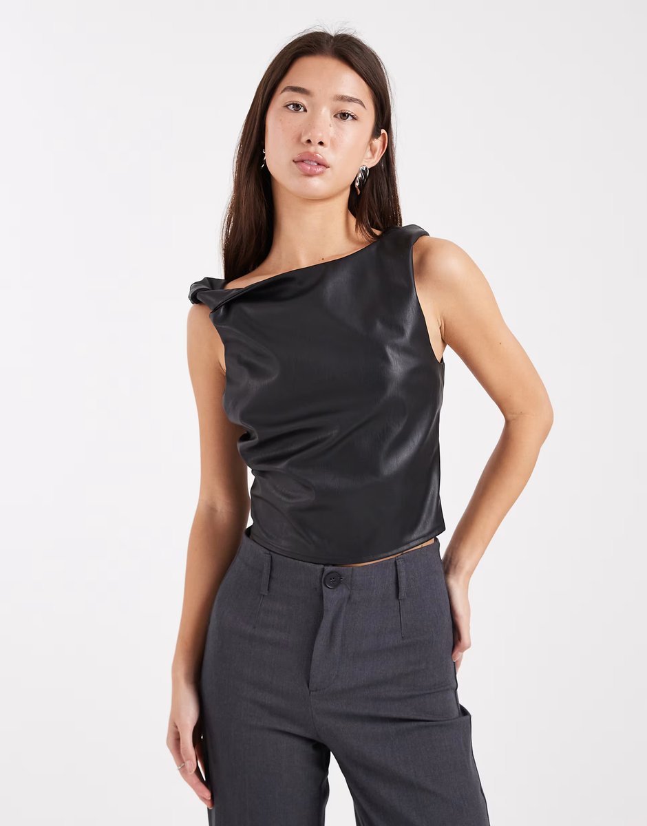 The ASOS Miss Selfridge Faux Leather Twist Top in Black is ideal for casual, evening.
