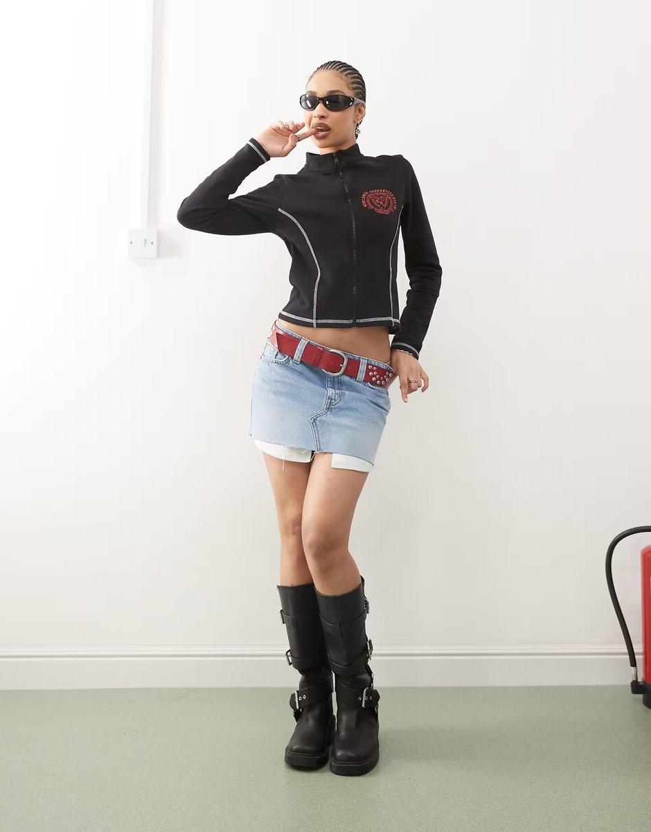 The ASOS Monki Low Waist Denim Mini Skirt in Light Blue is available in sizes XXXL, XXL, XL, XS, L, M, S.