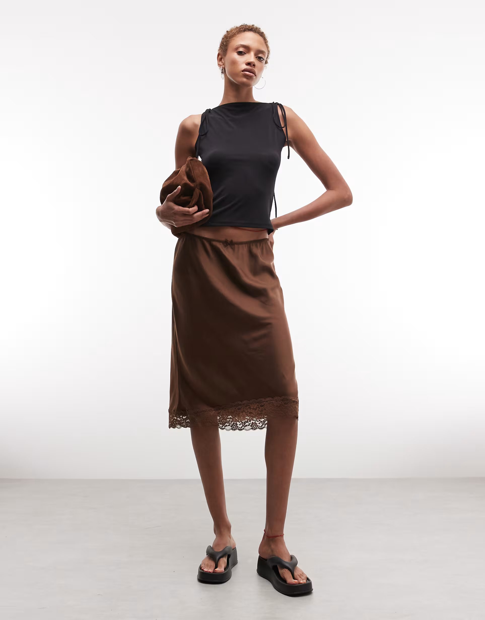 The ASOS Satin Look Lace Midi Skirt in Brown is ideal for casual, smart-casual.