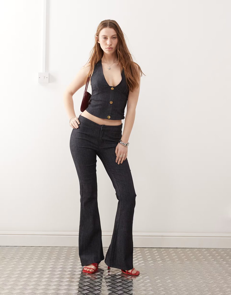 Dark indigo Motel ORIA Denim Co-ord by ASOS. This co-ord features a sleeveless crop top with a V-neckline and a pair of high-waisted, flared trousers. Crafted from denim, it offers a relaxed fit perfect for casual outings. The set includes yellow button closures and is designed to be worn as a stylish, versatile outfit.