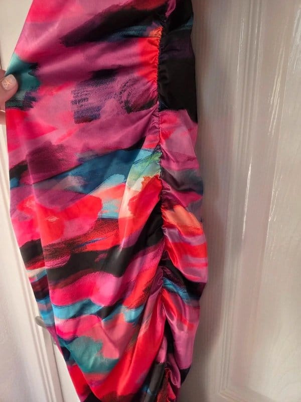 This multicoloured cross-back satin midi dress features a brush stroke pattern and ruched details down the sides. Perfect for special occasions, this dress is from ASOS.