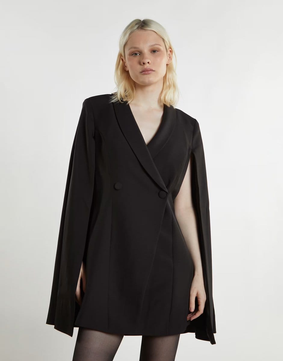 The ASOS Double Breasted Blazer Dress with Cape in Black is available in sizes XXXL, XXL, XL, XS, L, M, S.