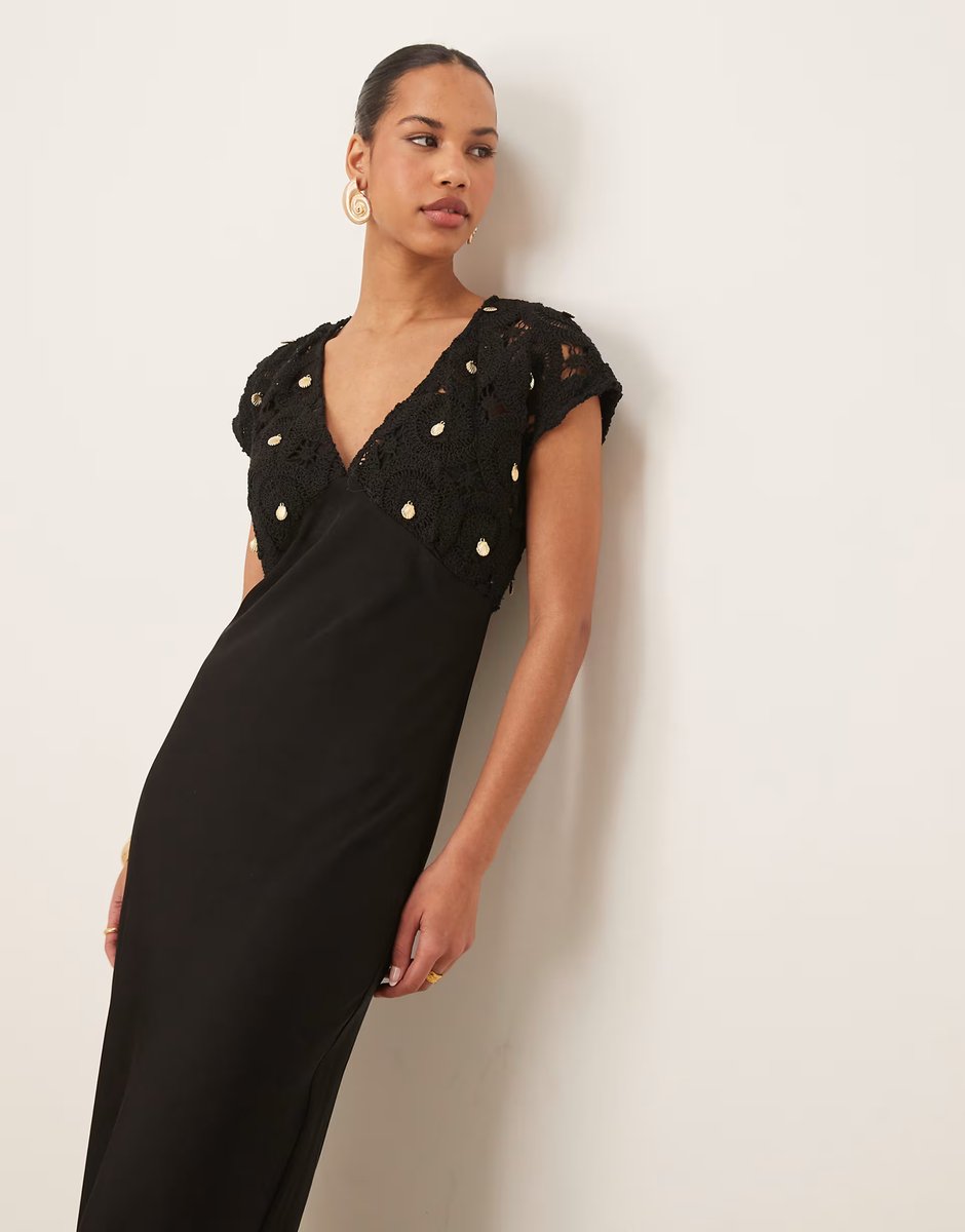 The Never Fully Dressed Crochet Shell Maxi Dress in Black is ideal for evening, beach.