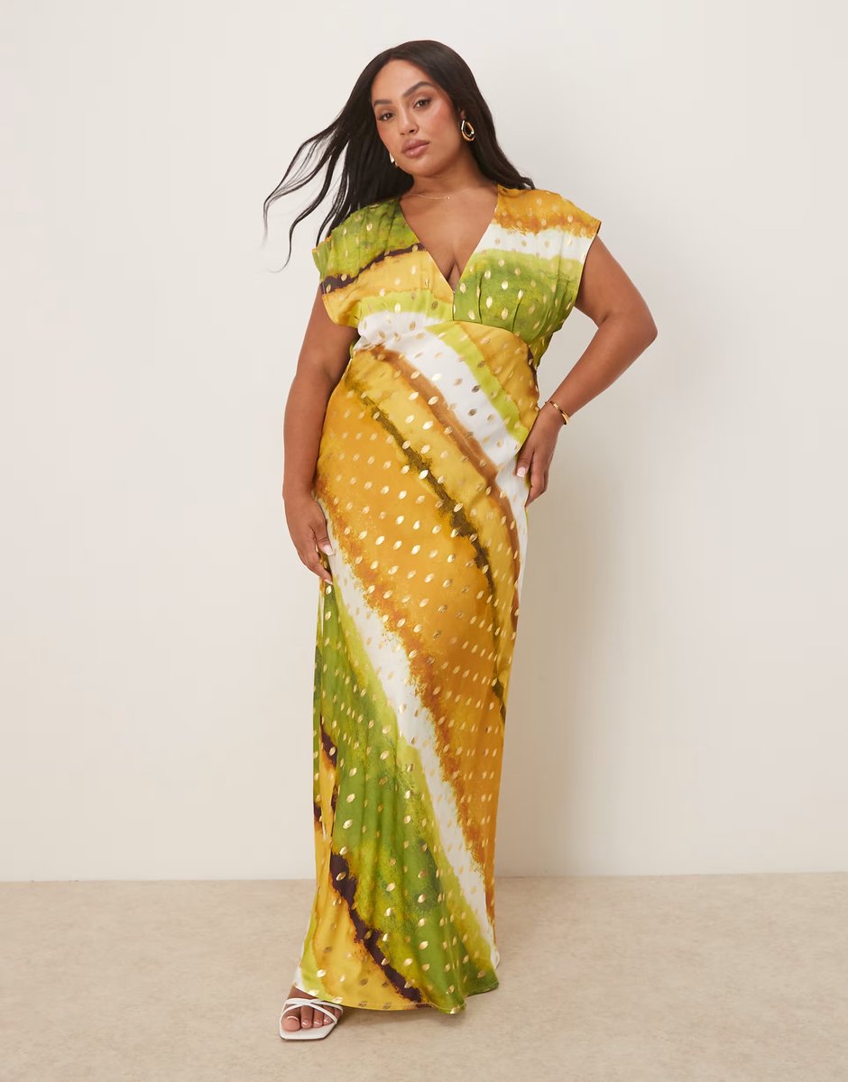 The Never Fully Dressed Plus Metallic Midi Dress in Green Ombre Print is ideal for party, evening, date-night.