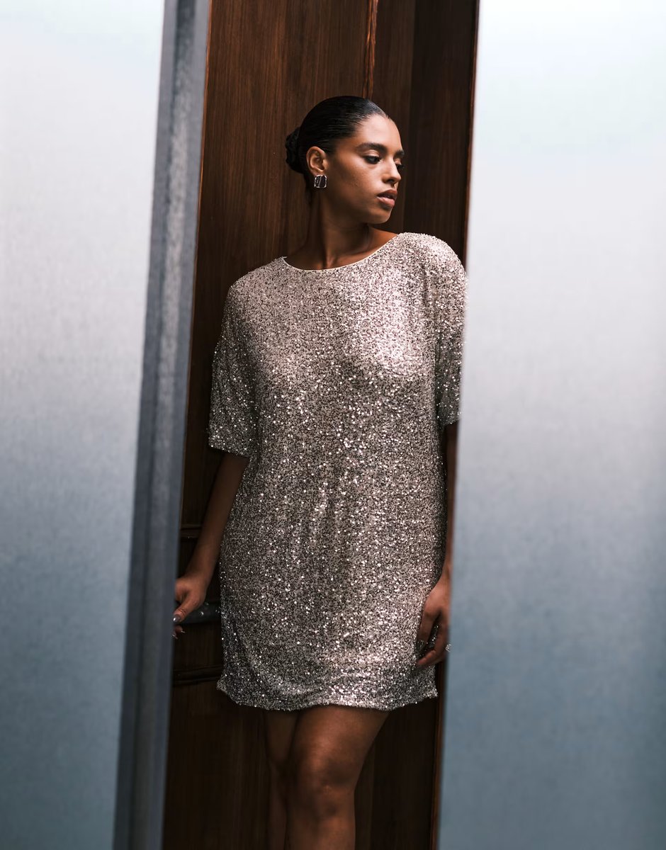 A dazzling silver sequin mini dress by ASOS featuring a round neckline and short sleeves, perfect for a glamorous evening out.