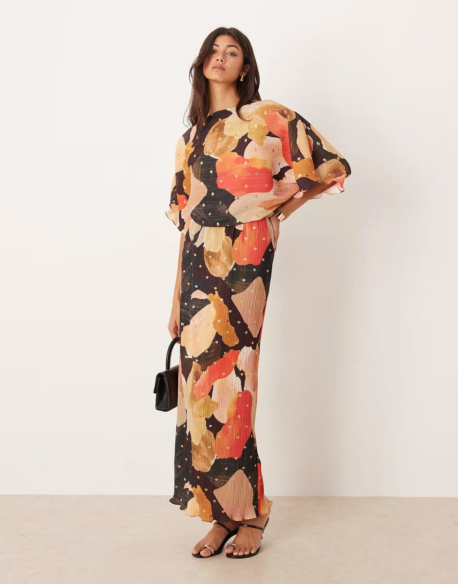 Vibrant Coral and Chocolate Plisse Off-Shoulder Maxi Dress — the ultimate statement piece for any evening event. Designed in a coral and chocolate print, this off-shoulder maxi dress features dramatic blouson sleeves and a full skirt with ruffled details. Crafted from lightweight plisse fabric with gold foil accents, it exudes elegance and glamour. The perfect addition to your evening wear collection.