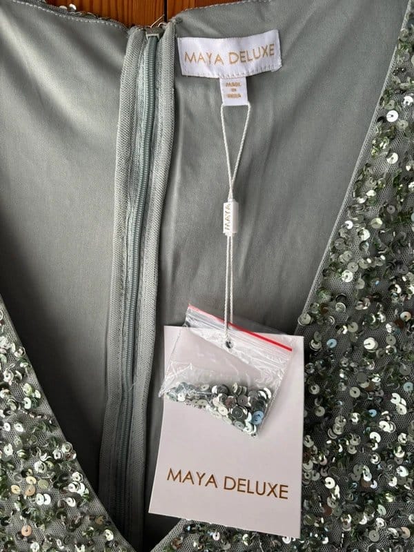 This sage green sequin and tulle maxi dress from ASOS features a sparkly sequin bodice with a sheer tulle skirt. Perfect for evening events or special occasions.