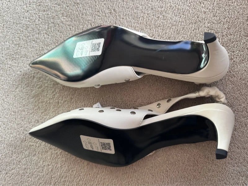 Chic ASOS kitten heel sandal in white faux leather with silver metal stud details along the back. Features a zip closure and a pointed toe. Perfect for adding a touch of elegance to any outfit.