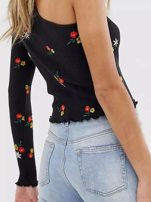 The ASOS Floral Embroidery Ribbed One Sleeve Top in Black is ideal for casual, evening.