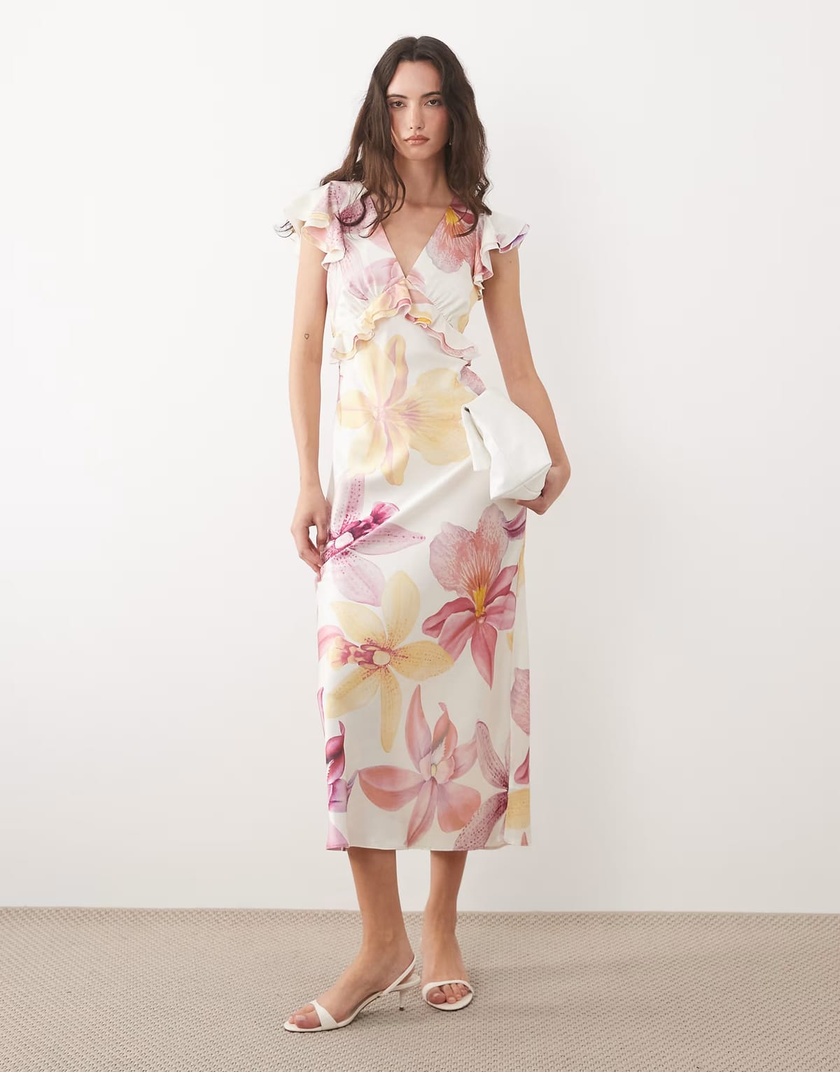 The ASOS Flower Print Flutter Sleeve Satin Midi Dress in Cream is ideal for evening.