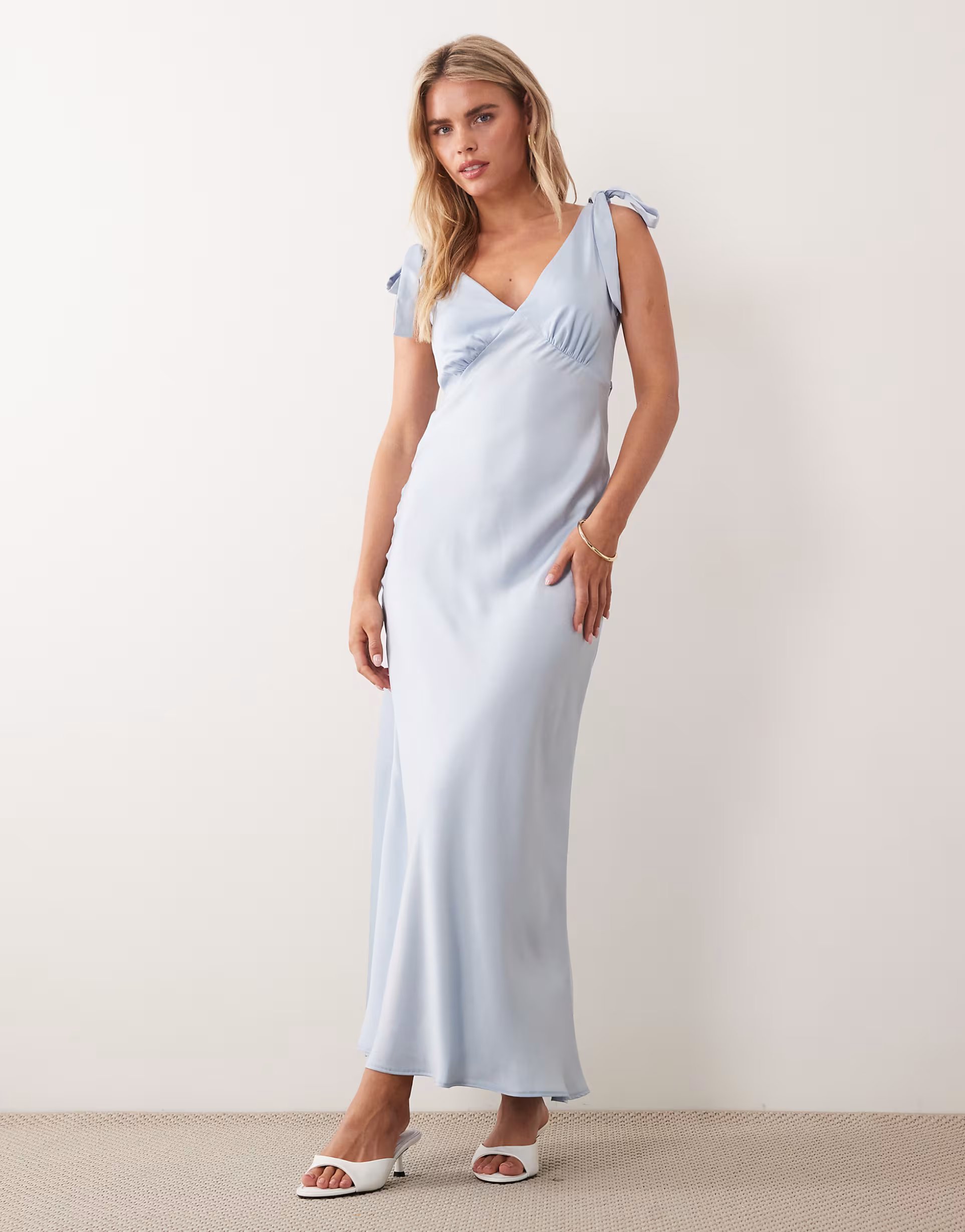 This elegant light blue satin midi dress from New Look Petite at ASOS features a tie shoulder neckline. Its flowing silhouette makes it perfect for a variety of occasions.