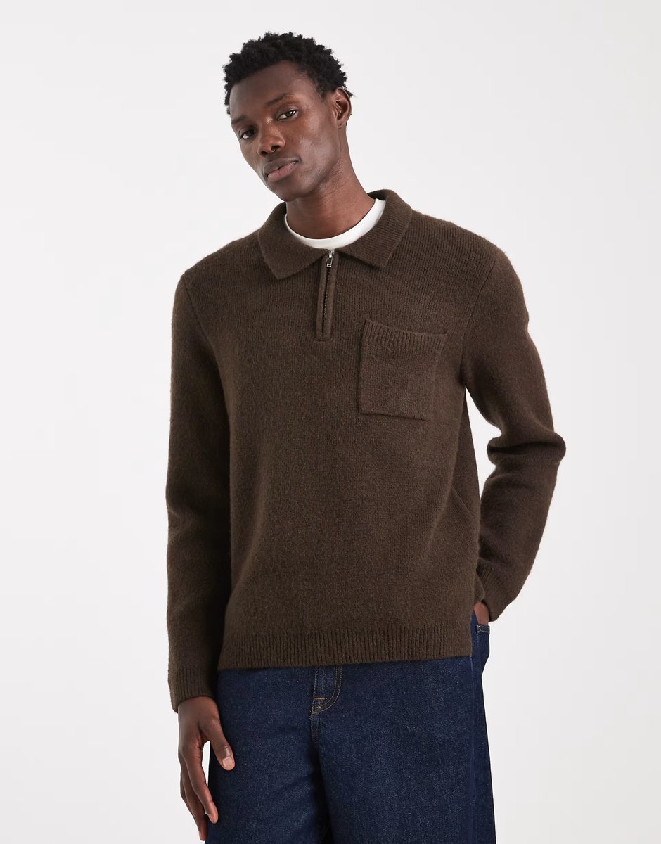 The ASOS Dark Brown Knitted Polo Jumper is ideal for casual, smart-casual.