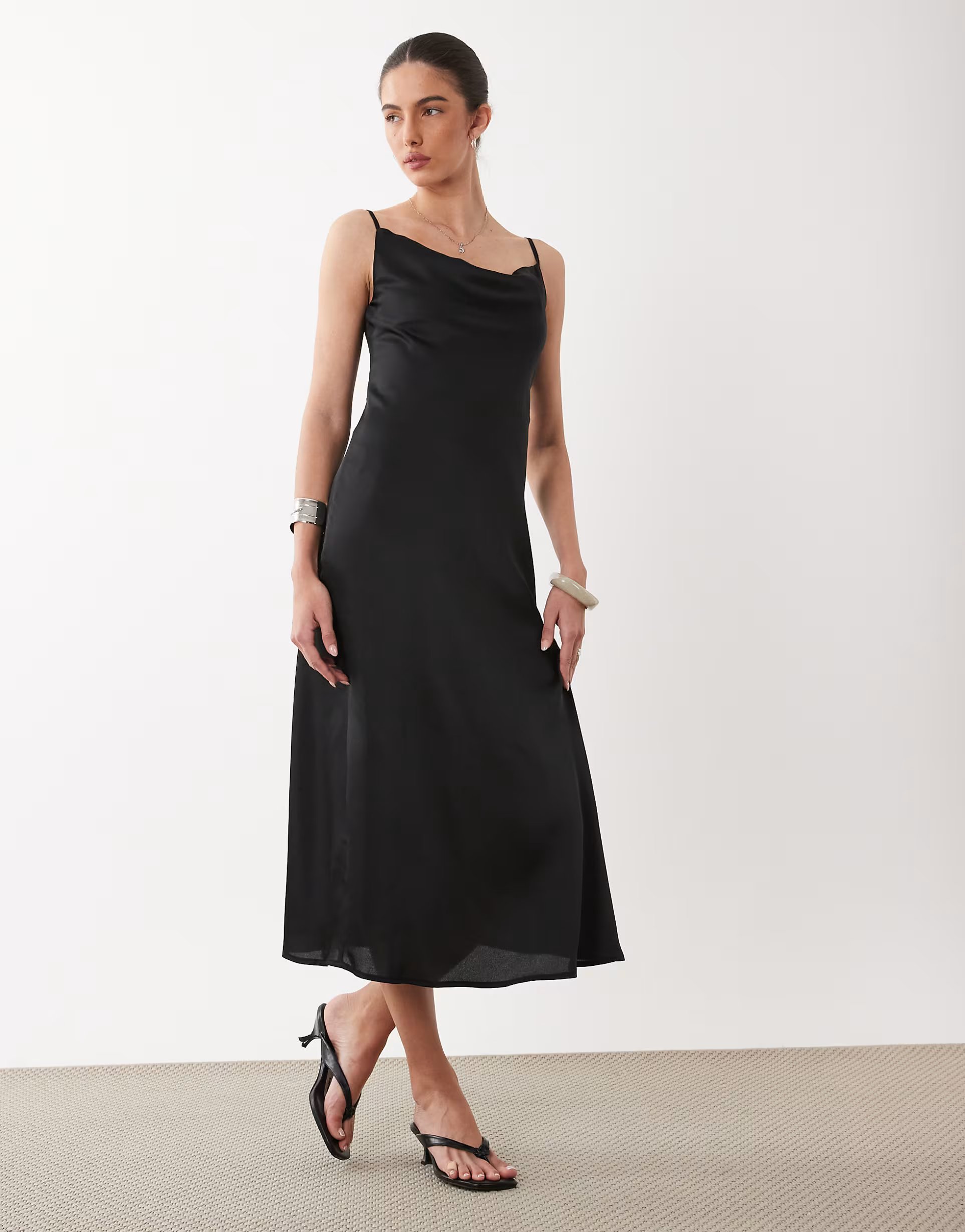 The ASOS Satin Cowl Neck Midi Dress in Black is made from satin.