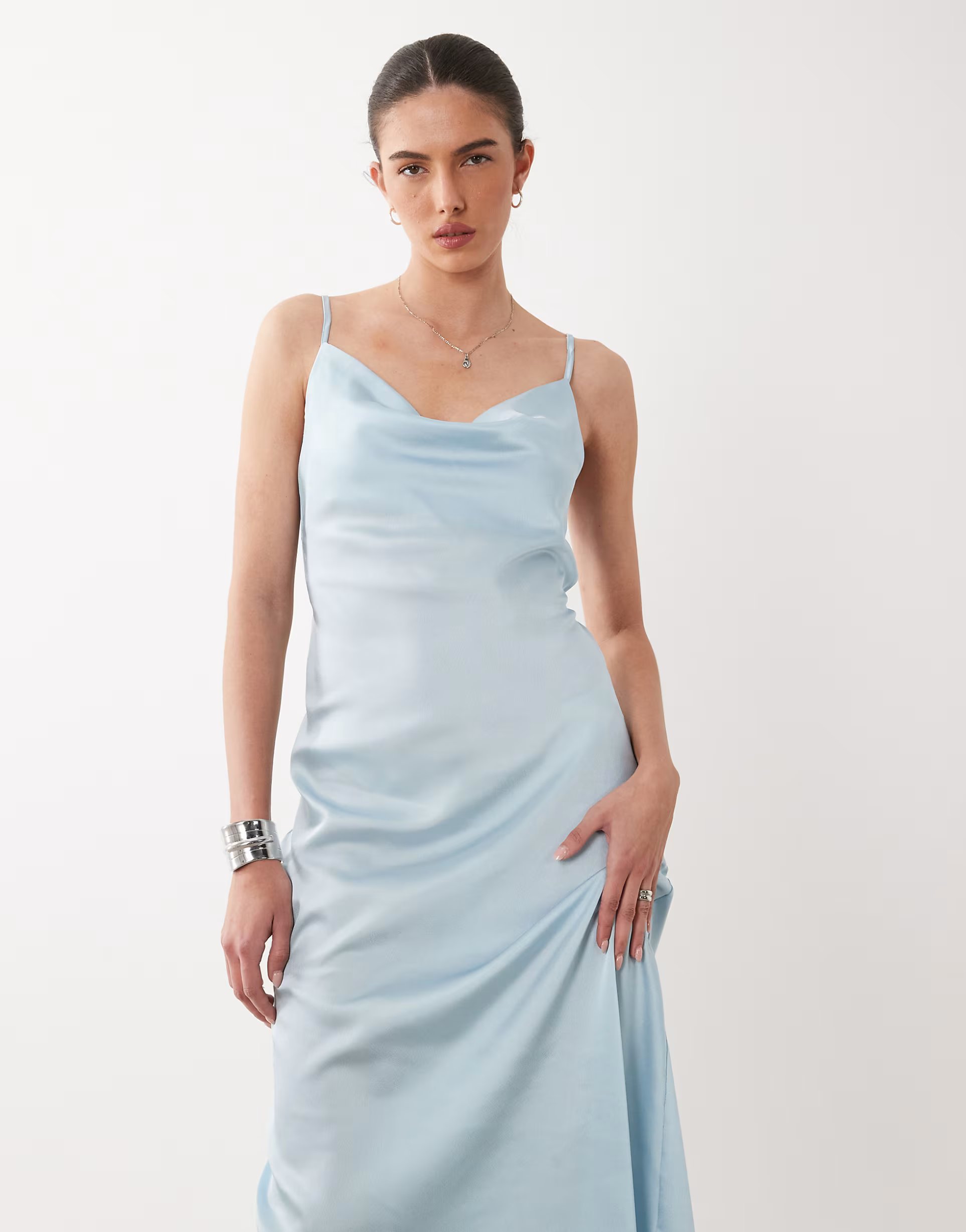 This light blue midi dress by ASOS is crafted from satin, offering a sleek and elegant silhouette. The cowl neckline adds a touch of sophistication, making it perfect for special occasions.