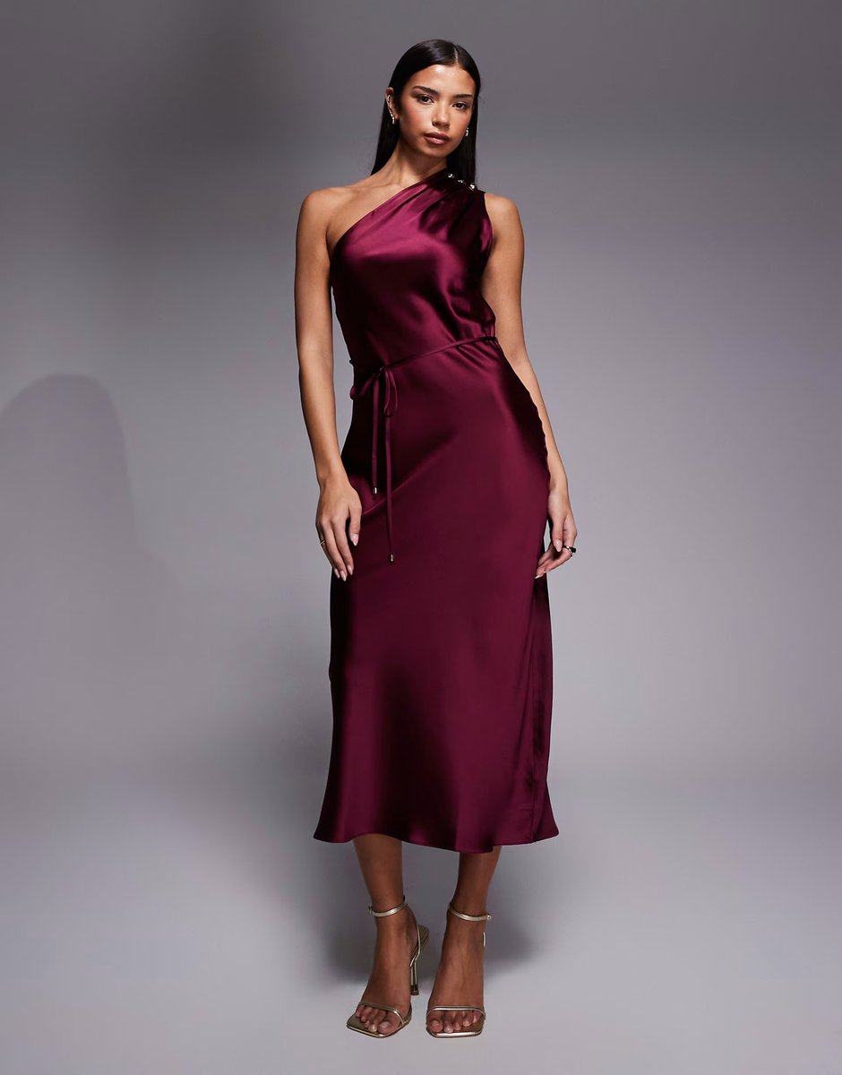 The New Look Satin One Shoulder Midi Dress in Burgundy is ideal for evening, formal, party.
