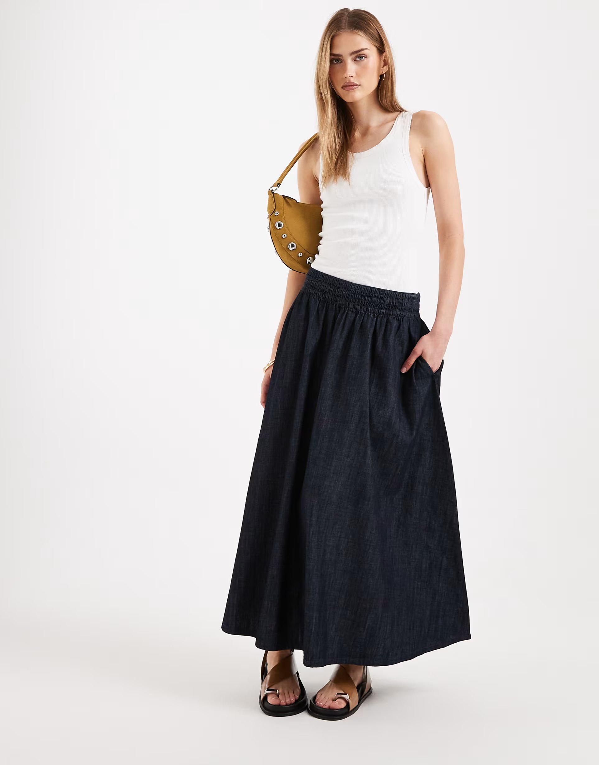New Look shirred waist denim midi skirt in indigo, perfect for a versatile addition to your wardrobe. The skirt features a shirred waist for a flattering fit, and a midi length that's perfect for both casual and dressy occasions.