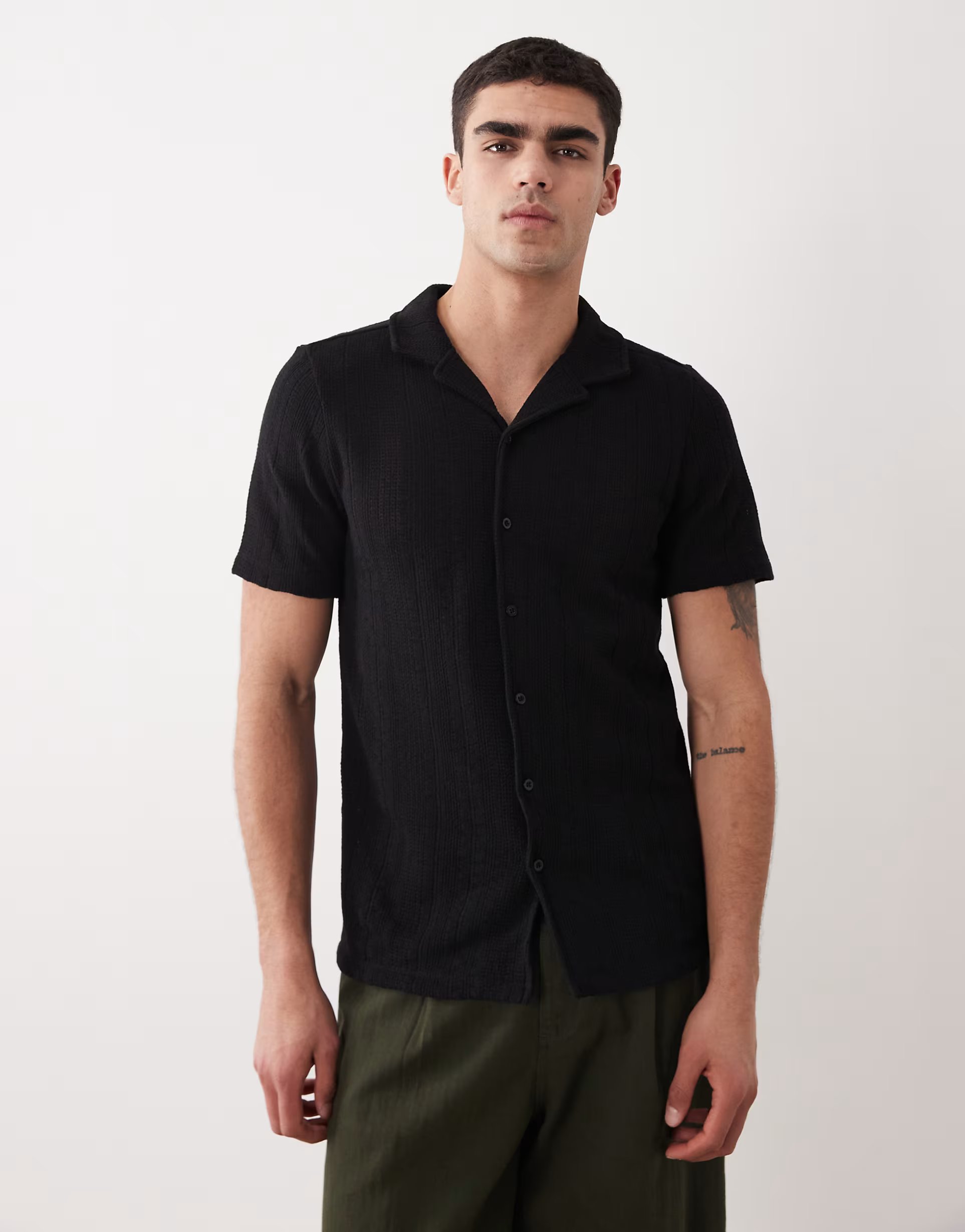 The ASOS Textured Knitted Revere Shirt in Black is ideal for casual, work.