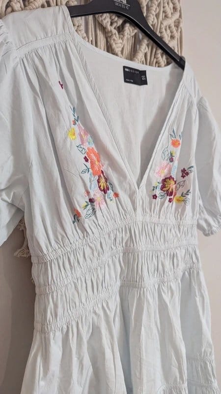 The ASOS Light Blue Embroidered Floral Beach Dress is available in sizes L.