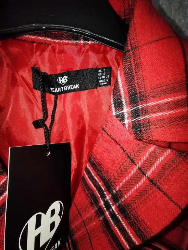 Red Check Tartan Blazer Mini Dress by Heartbreak at ASOS. Designed in a vibrant red check tartan pattern, this bodycon mini dress features a notch collar, padded shoulders, and a button front. The cut-out panel adds a trendy touch, making it perfect for going out, date nights, and party occasions. Crafted from a blend of polyester and cotton, it offers a comfortable and stylish fit.