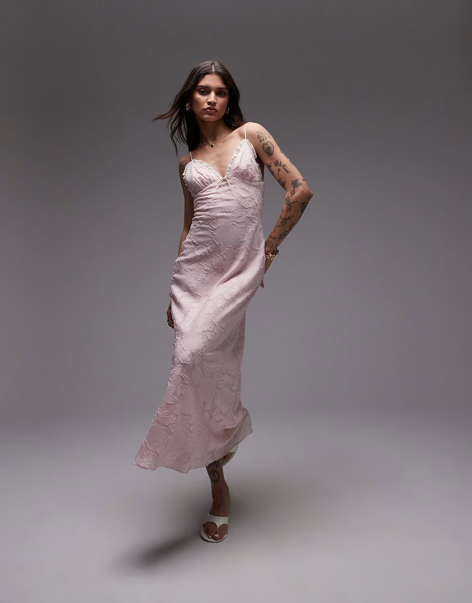 The ASOS Nia Camille Flocked Midi Dress in Blush Pink is ideal for evening, special occasion.
