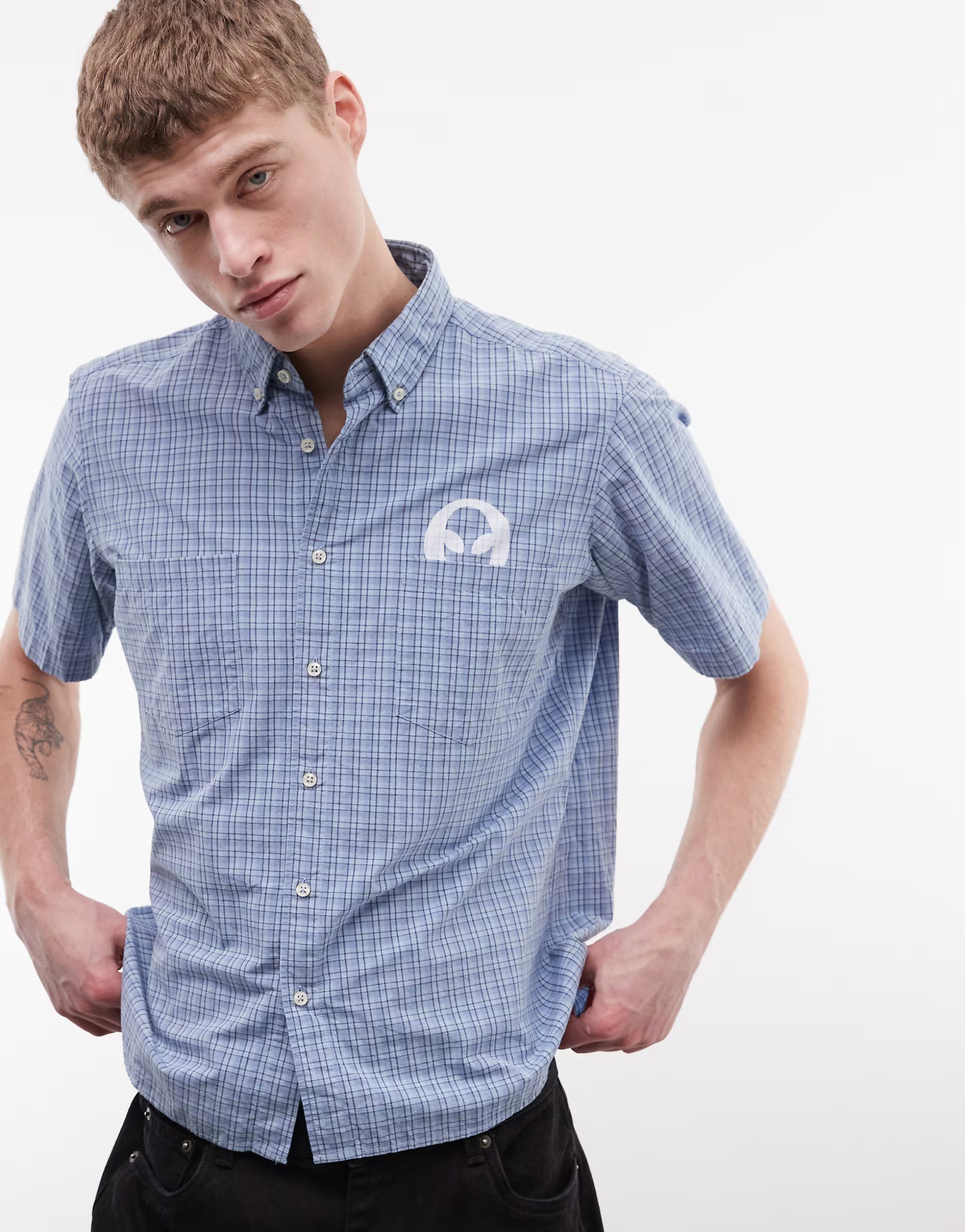 Designed with blue micro check pattern, this 100% cotton shirt features an alien logo on the left chest. Perfect for a casual look.