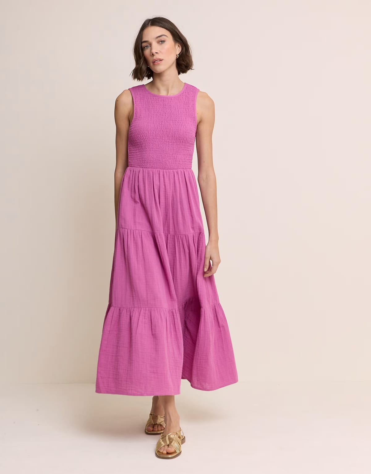 See all outfit ideasStylish maxi dress in purple featuring a shirred bodice and tiered skirt. Made from cotton-rich fabric for a comfortable fit. Ideal for summer events or casual outings.