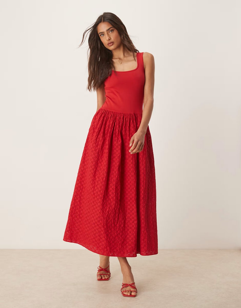 This vibrant midi dress from Nobody's Child at ASOS features a striking red color with a broderie skirt for a feminine touch. The scoop neck and sleeveless design make it perfect for warm weather.