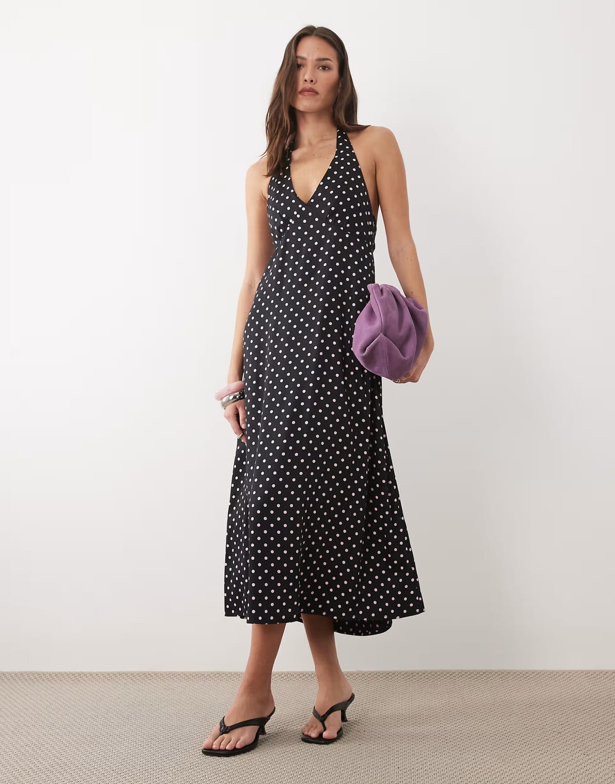 The ASOS Black Polka Dot Halter Neck Midi Dress is ideal for casual, outings, summer events.