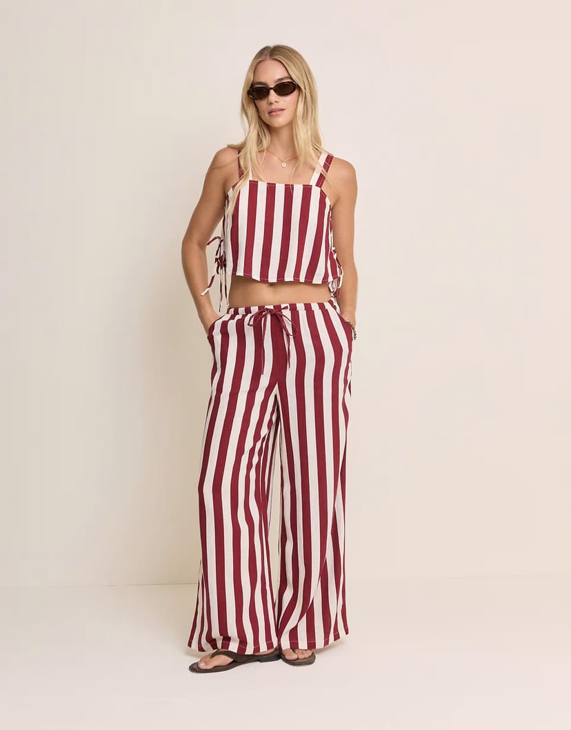 Stylish Reese wide leg trousers in a red and white striped linen blend. Featuring a drawstring waistband and high-waisted fit, these trousers are perfect for a casual yet chic look. Pair with the matching crop top for a coordinated ensemble.