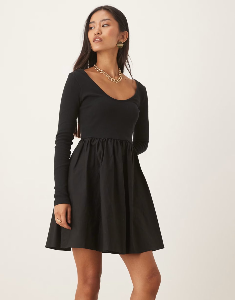 The ASOS Scoop Neck Long Sleeve Mini Dress in Black is ideal for evening, casual, date-night.