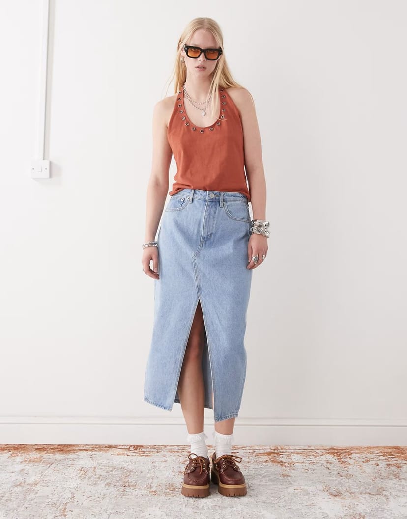 The Obey Simplex Light Wash Blue Denim Midi Skirt is ideal for casual, evening, party.
