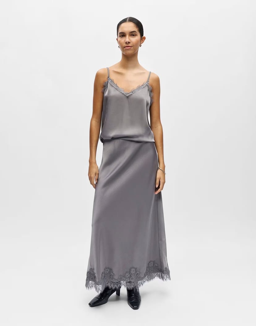 Elegant brushed nickel satin maxi skirt with a high waist and full, floor-length silhouette. Features delicate lace trim around the hem and adjustable straps for a versatile fit. Perfect for evening events or special occasions.