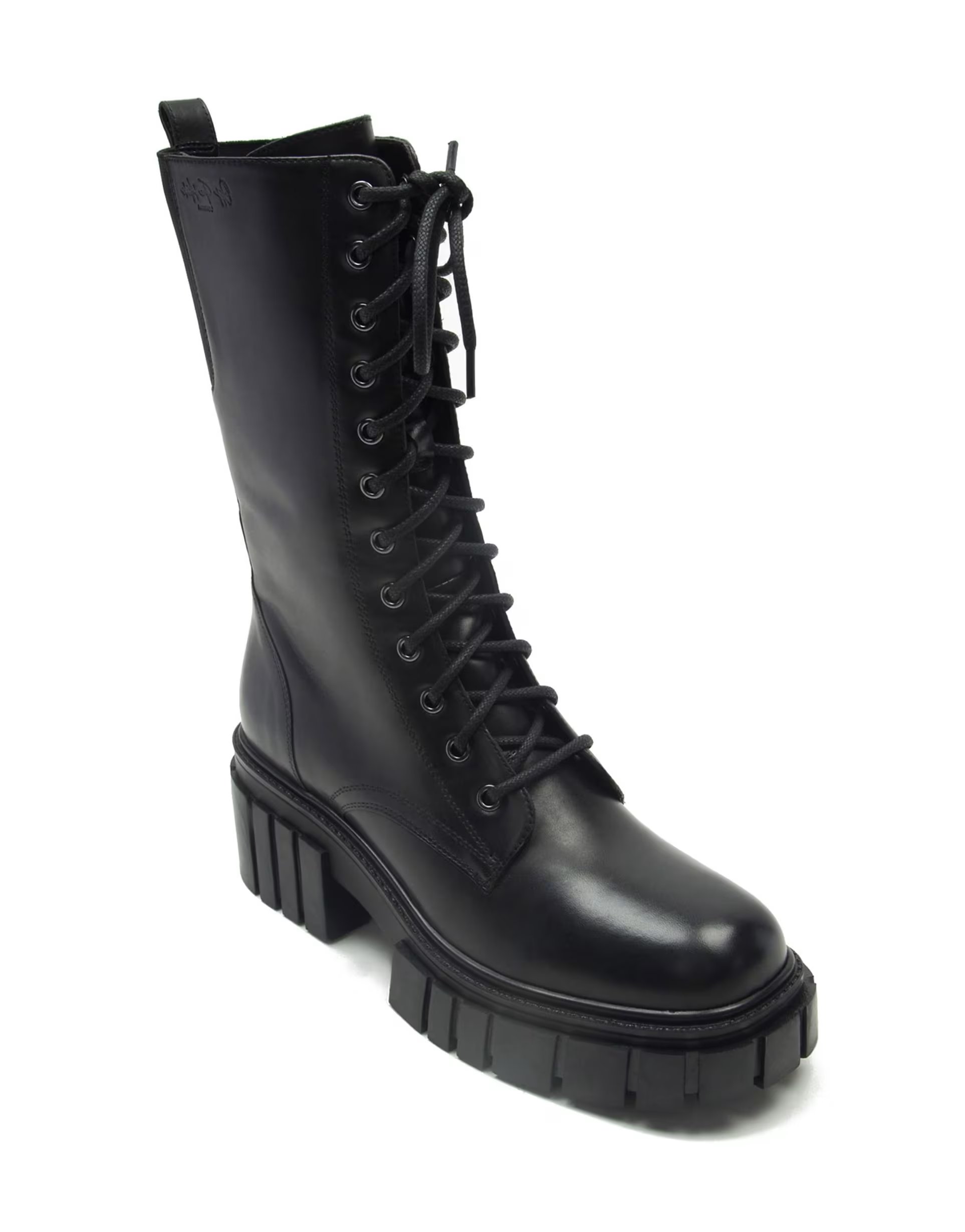 OFF THE HOOK CANNON leather lace up high knee boots in black. These boots feature a sleek design, perfect for adding a bold statement to any outfit.
