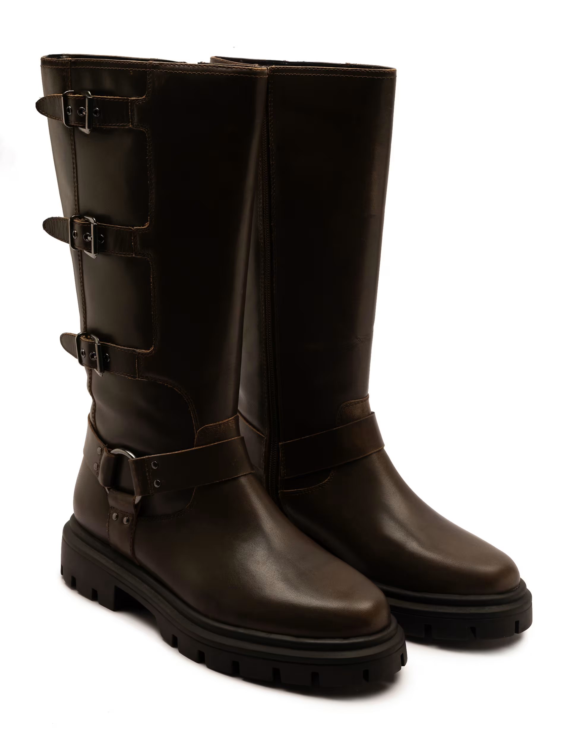 The ASOS Mauley Leather Knee-High Biker Boots in Copper is available in sizes XXXL, XXL, XL, XS, L, M, S.