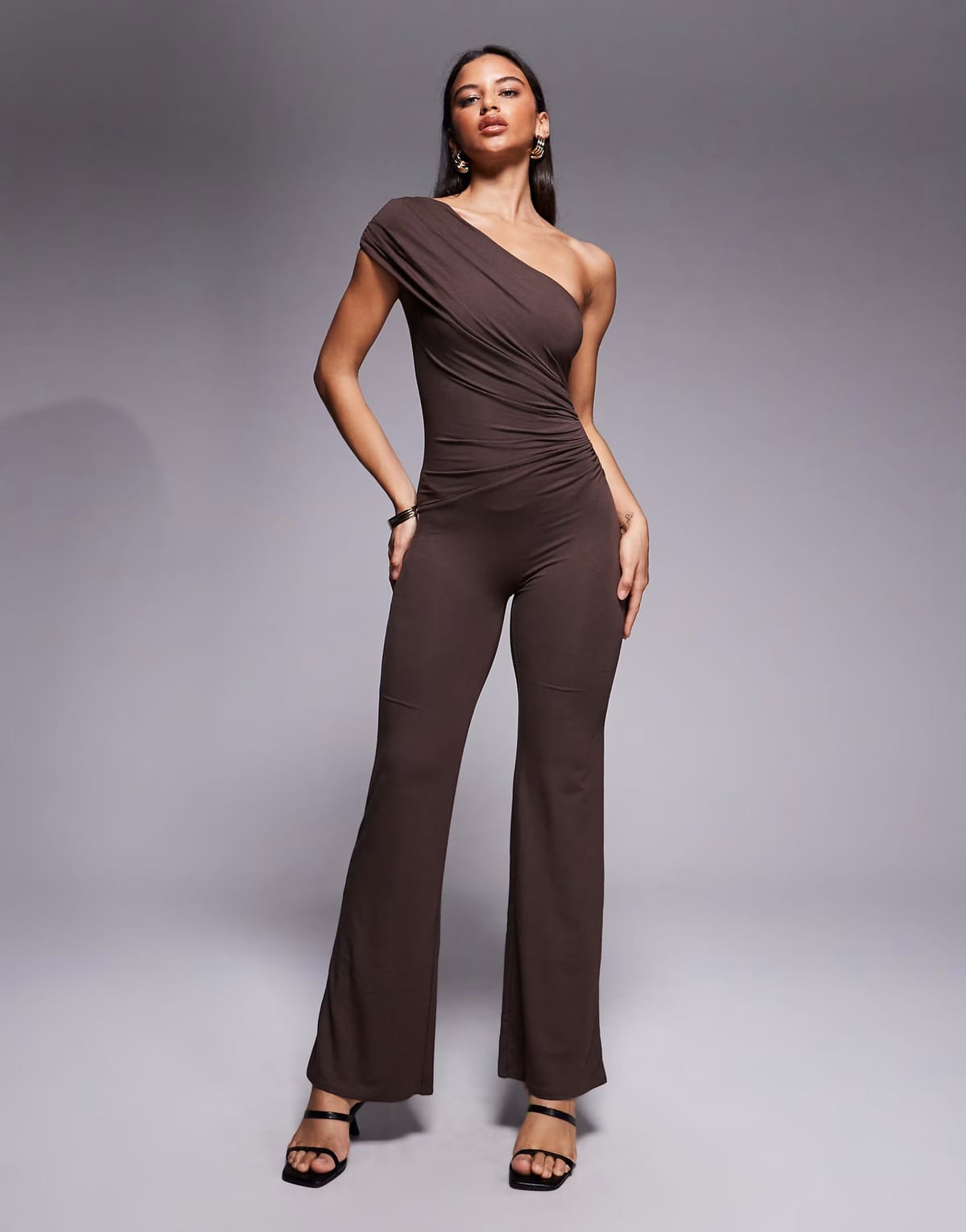 The ASOS Oh Polly Asymmetric Shoulder Jumpsuit in Brown is made from stretch fabric.