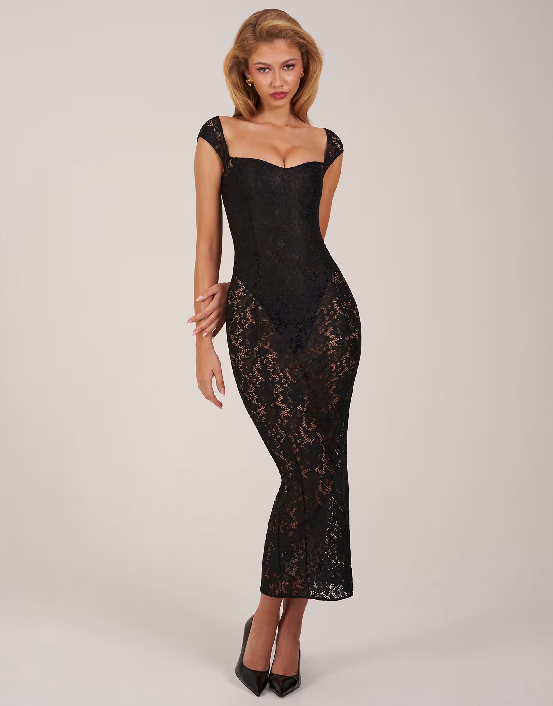 This black sweetheart neckline, cap sleeve mesh maxi dress by Oh Polly from ASOS is perfect for evening events. The intricate lace pattern adds a touch of elegance, while the flattering silhouette ensures a stunning appearance.