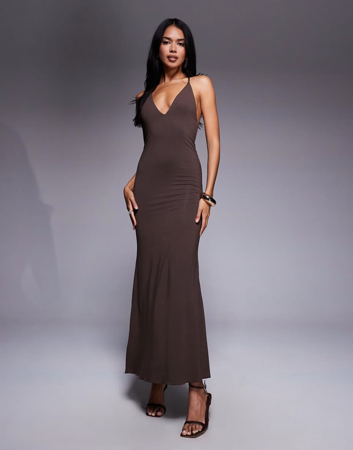 The ASOS Plunge Halter Neck Maxi Dress in Chocolate Brown is made from stretch fabric.