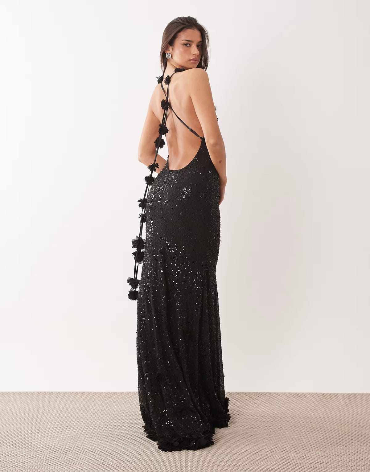 This black gown from Oh Polly features an open-back design with embellishments. Perfect for evening events.