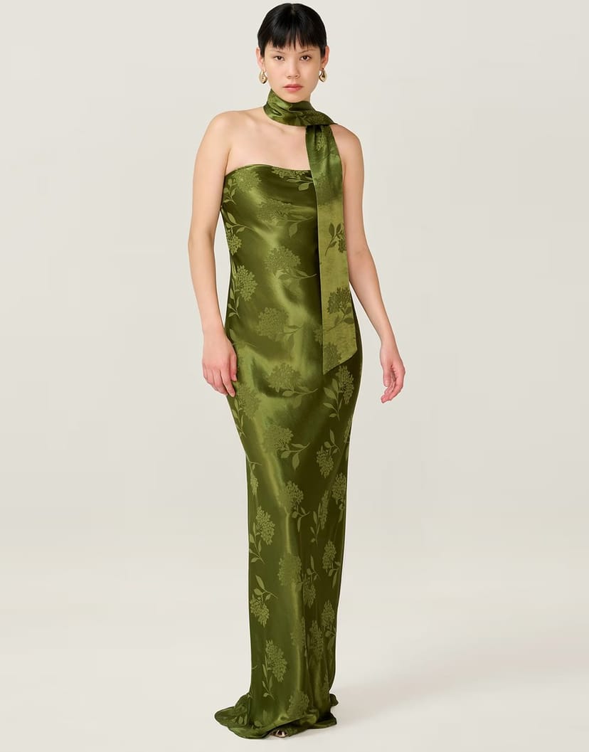 The ASOS Myla Maxi Fitted Viscose Floral Jacquard Dress in Green is available in sizes XXXL, XXL, XL, XS, L, M, S.