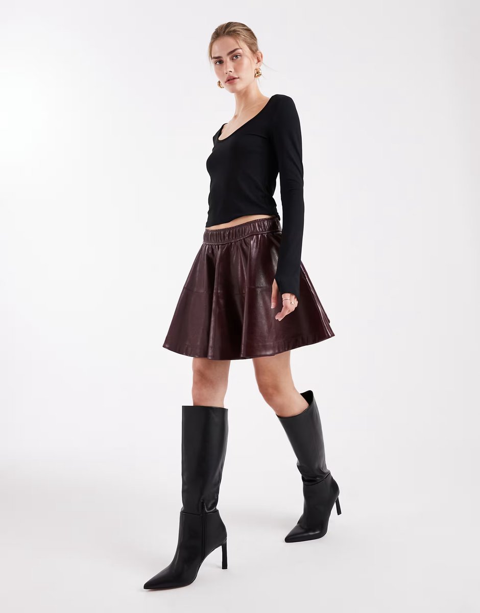 The ASOS Faux Leather Skater Skirt in Burgundy is ideal for casual, evening.