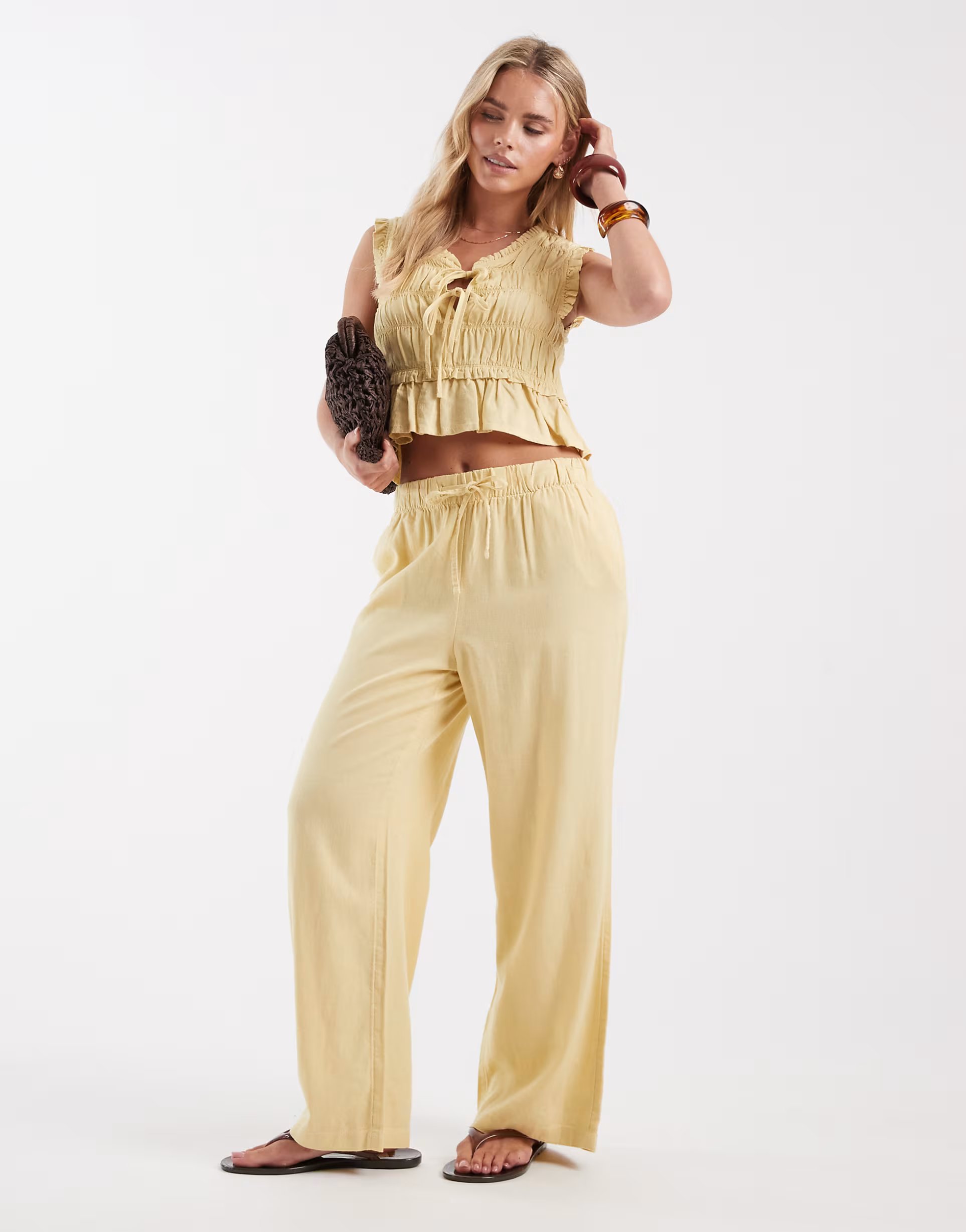 Crafted with a linen blend fabric, this pale yellow co-ord features a tie front and ruched detailing. Perfect for a relaxed, casual look.