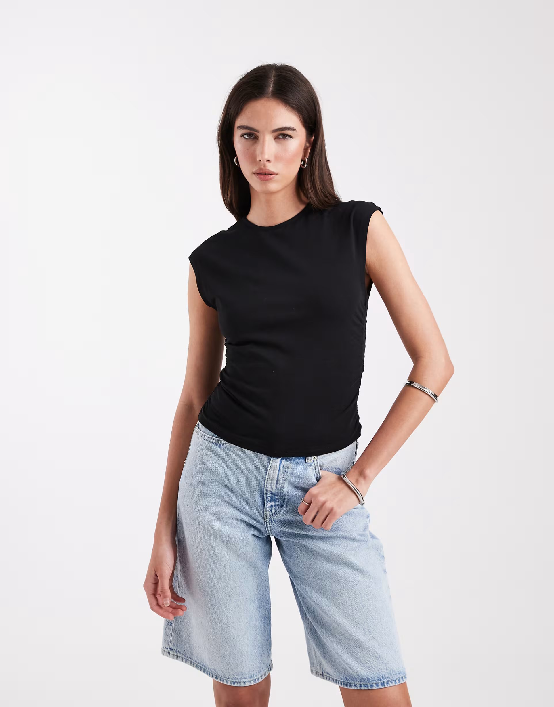 The ASOS Sleeveless Ruche Top in Black is ideal for casual.