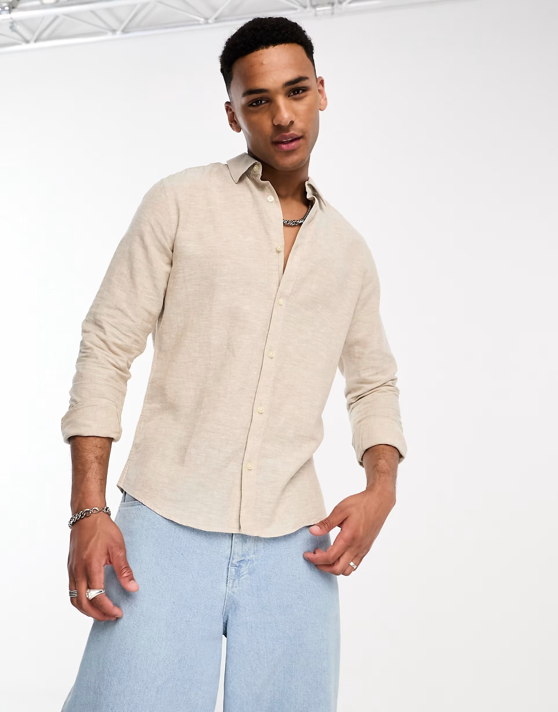 The ASOS ONLY & SONS Linen Mix Long Sleeve Shirt in Beige is ideal for casual.