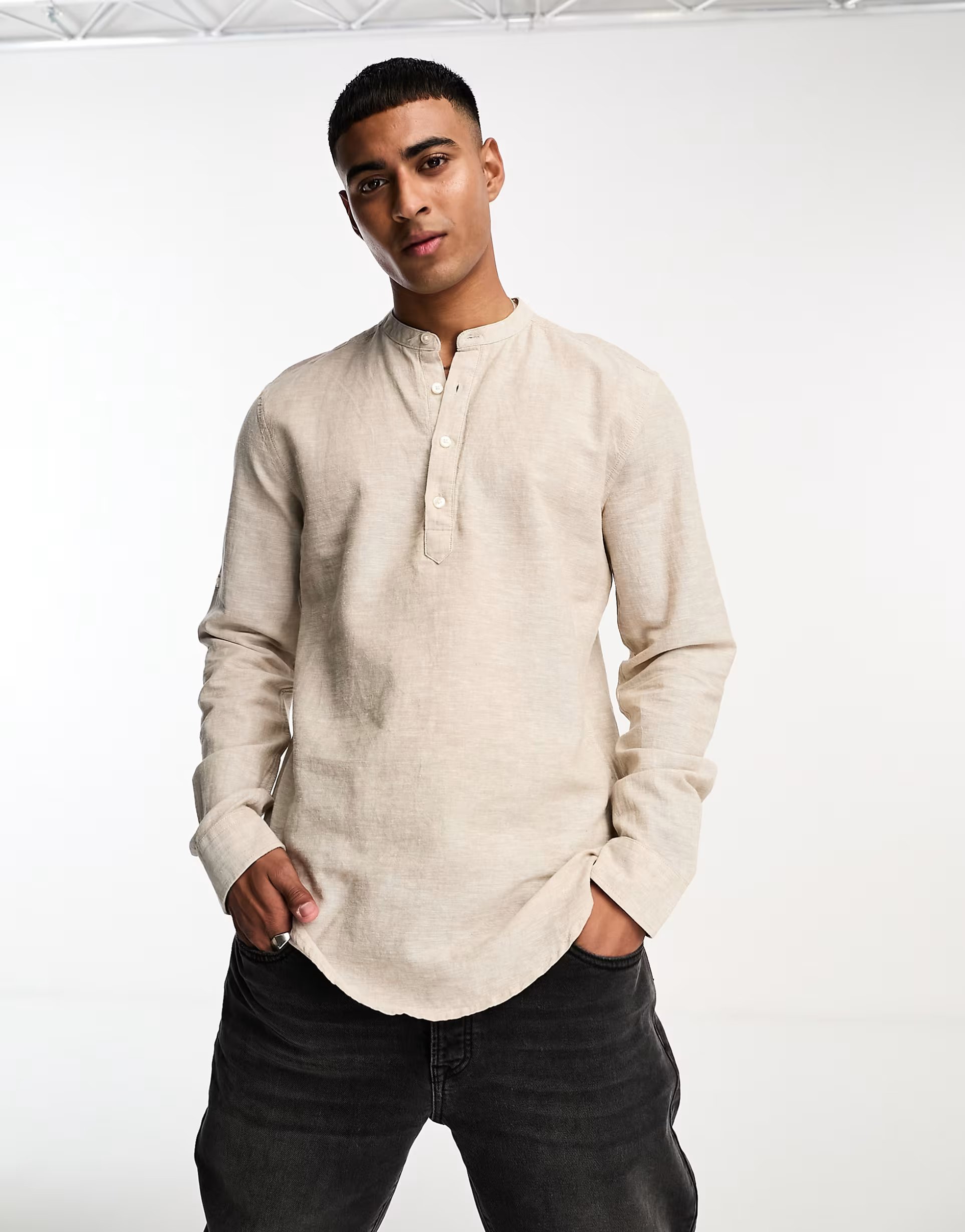 The ASOS & Sons Linen Mix Long Sleeve Shirt in Beige is made from linen, cotton.