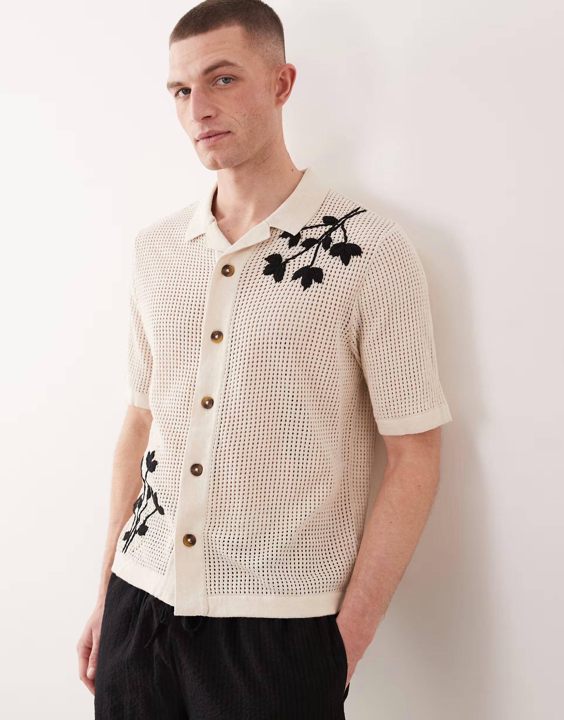 The ASOS Only & Sons Crochet Shirt with Floral Embroidery in Cream is available in sizes XXXL, XXL, XL, XS, L, M, S.
