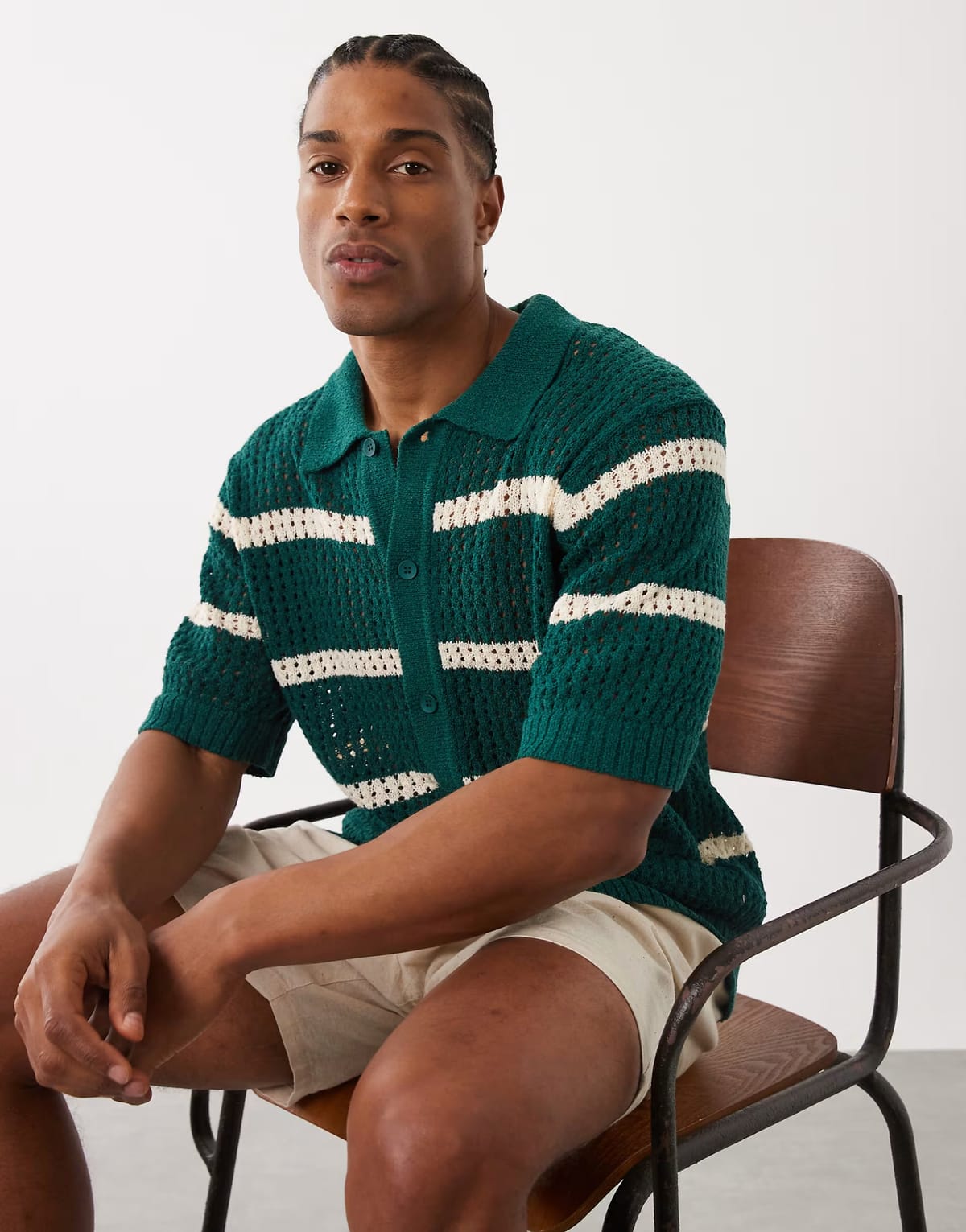 This ASOS shirt features a relaxed fit with a crochet knit design. The green and white striped pattern adds a stylish touch. Ideal for casual outings.