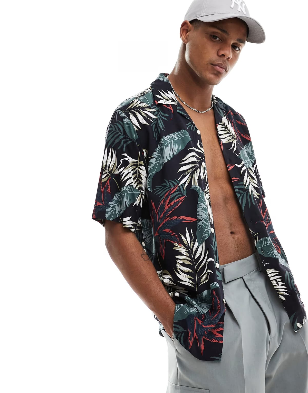 The ASOS Black Leaf Print Viscose Shirt with Revere Collar is ideal for casual, everyday, beach.