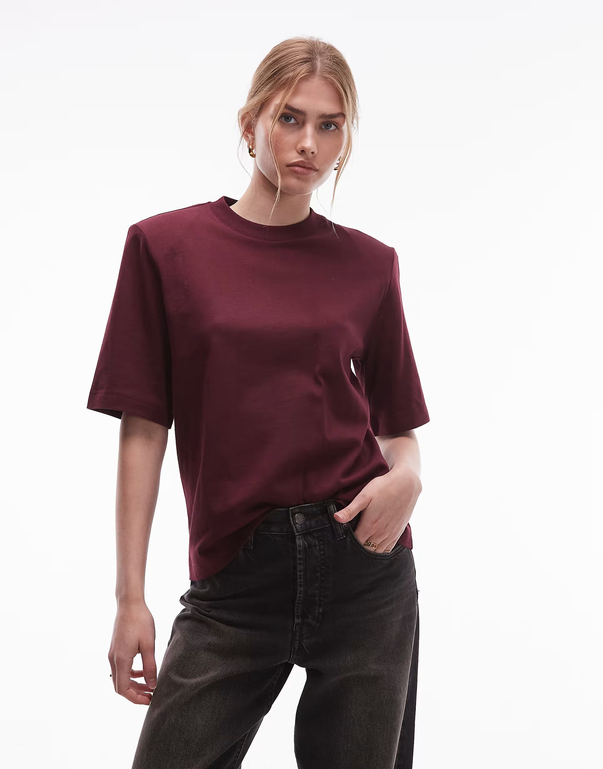 The ASOS Structured Jersey Top with Shoulder Pads in Dark Wine is ideal for evening.